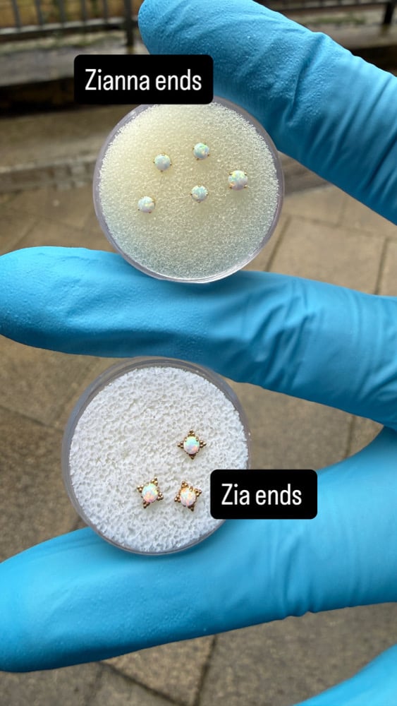 ASTM F-136 certified implant grade titanium, Niobium and 18ct Solid Gold. Each item is hand polished to a mirror finish for an extremely smooth surface and of course, carries a lifetime guarantee against defects!
